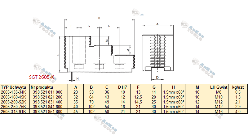 Szczęki górne twarde do uchwytu czteroszczękowego z mocowaniem mechanicznym 2605-160-45K